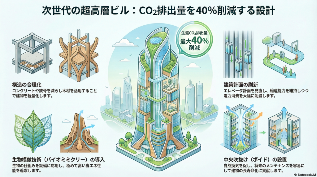 建物が生涯で排出するCO2(ホールライフカーボン)を抑制するため、建築計画、構造、設備を徹底的に合理化し、最大40%の排出量削減を目指す次世代超高層ビルのプロトタイプが提案されています。
