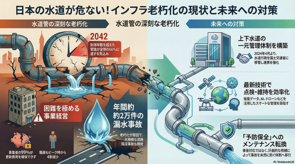 これに対し、国は2024年4月に上水道管理を国土交通省へ移管し、上下水道の一元管理体制を構築しました。現在は、経営の広域化や、衛星データ・AI・ドローンを活用した点検の効率化、予防保全型メンテナンスへの早期転換が推進されています。