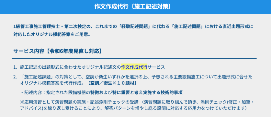 | おすすめな人 | ある程度の現場経験があり、文章を書くことが苦手ではない人 スキマ時間を有効活用したい人 | 文章を書くのが苦手で、経験記述の作成代行を依頼したい人 費用を抑えたい人 |