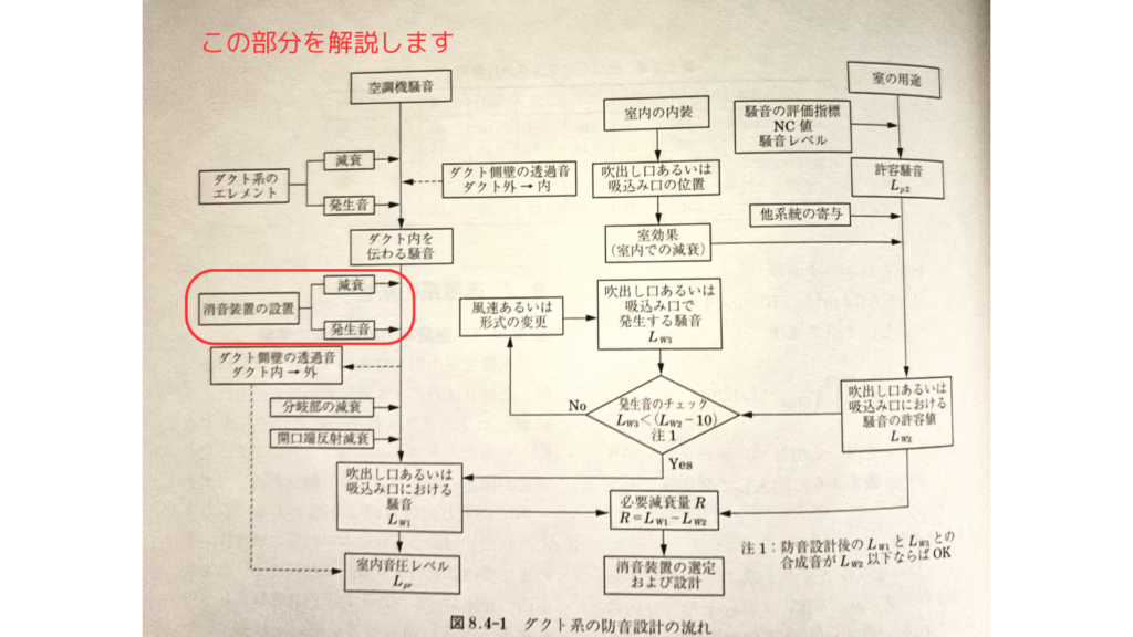 - 機器のオクターブバンド騒音値から消音器や直線部の減衰を求めて、吹き出し位置での残騒音を求める。静圧計算と考え方は同じで、対象とするエネルギーが圧力か音かの違いだけ。